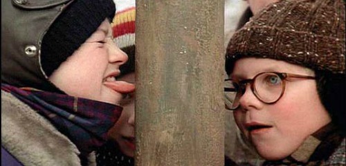 But still, the boy backs off. He’s afraid his tongue will stick to the frozen flagpole. And then, then, the antagonist goes for the jugular. “I triple dog dare you!”