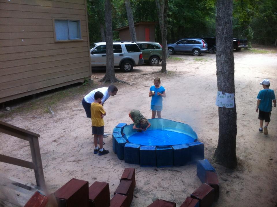 To tell the story, we are all sitting in the dining hall at our campsite. I get one kid to put on sunglasses and hold a white cane to play the part of the blind man. Another little boy playing Jesus, puts Play Dough – “mud” – on the man’s eyes. And we have a kiddie pool outside filled with water that is the Pool of Siloam. And so the blind man is led outside, with Play Dough on his eyes. But the rest of the campers stay inside.