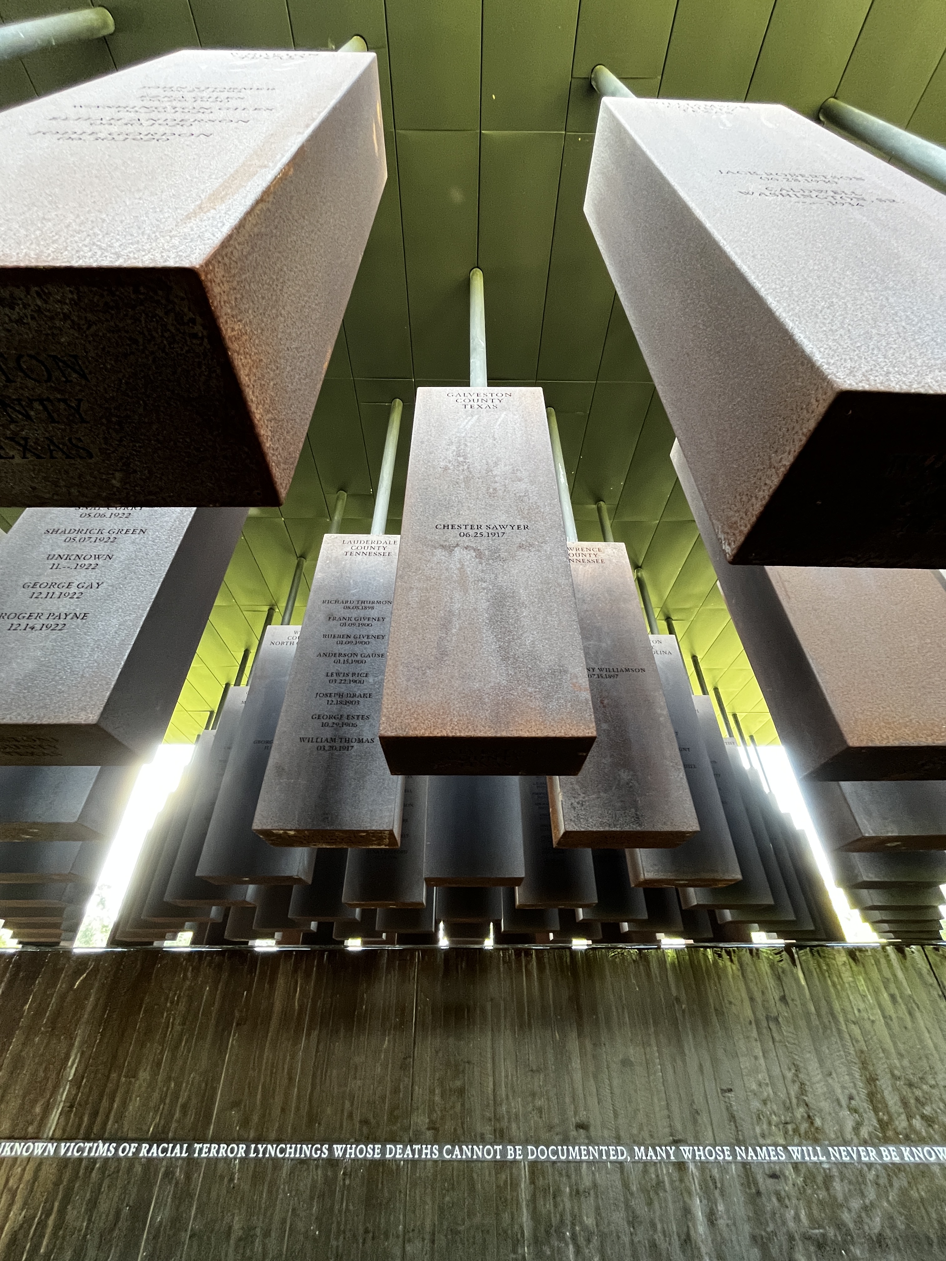 But one place in particular got to me this week. On this hill in Montgomery, Alabama, they have installed hundreds of big, rectangular metal columns, one for each county or parish in America where there was a lynching from 1877 to 1950. Surrounded by these, you start at the top of the hill and then weave your way down, reading the names on the columns as you go by. Counties in Alabama and Mississippi, yes, but also Minnesota, California, Delaware. And then, at the very bottom of the monument, you look right up above you and you see this column, hanging above you. Galveston County, Texas.
